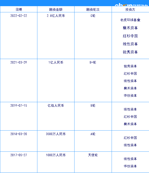 | 2021-03-29 | 1亿人民币 | B+轮 | 独秀资本 红杉中国 线性资本 襄禾资本 华创资本 |
