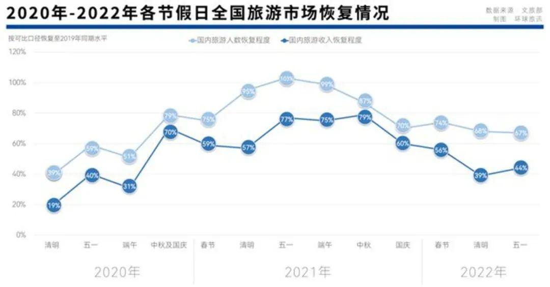 经文化部和旅游部数据中心测算,2022年“五一”假期期间,国内旅游出游1.6亿人次,同比减少30%,恢复至疫情前的66.8%;国内旅游收入646.8亿元,同比减少42.9%,恢复至疫情前的44.0%。