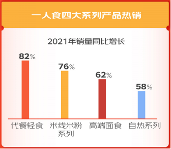 报告显示,2021年轻食代餐销售额同比增长82%,高居榜首。米线米粉系列,高端面食、自热系列,分别以76%、62%、58%同比增长的销售额紧随其后。