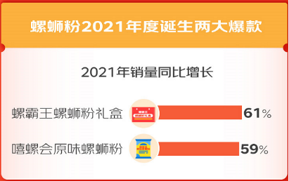 其中,2021年螺霸王螺蛳粉礼盒销量同比增长61%,嘻螺会原味螺蛳粉销量增长59%,成为两大爆款。