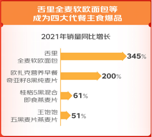 在健康水饮方面,隅田川百搭锁鲜咖啡液以266%的销量增长名列首位。伊利金典A2β-酪蛋白有机纯牛奶2021年Q4环比增长达68%;新疆麦趣尔纯牛奶2022年Q1销量环比增长超5.5倍,舌里全麦软欧包销量增长345%。