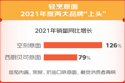 在轻烹意面领域,空刻意面销量暴涨126%。番茄肉酱,黑椒,奶油成为最受消费者青睐口味。