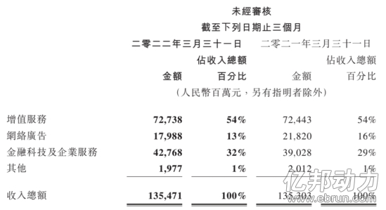 腾讯2022年第一季收入为1355元,同比基本稳定。从收益结构上看,增值服务、网络广告、金融科技及企业服务分别带来了727亿、180亿、428亿收入,占比分别为54%、13%、32%。