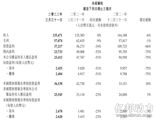 【亿邦原创】5月18日消息,腾讯控股今日发布了2022年一季度财报。财报显示,一季度腾讯营收1355亿元,市场预期1410.58亿元,上年同期1353.03亿元。净利润234亿元,同比下降51%。非国际财务报告准则下净利润255亿元,同比下降23%。