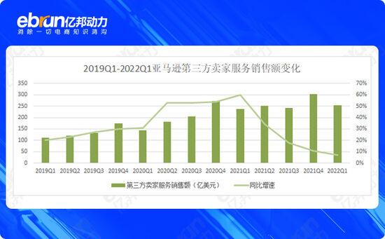 由于亚马逊不公布第三方卖家业务GMV,而财报中的“第三方卖家服务净销售额”主要包括佣金及FBA费用,因此可根据该数字大致推测第三方卖家业务增长趋势(GMV与第三方卖家服务净销售额成正相关)。在今年一季度中,亚马逊第三方卖家服务的净销售额为253.35亿美元同比仅增长7%,为最近13个季度当中的最低增速。