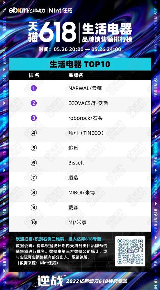再如生活电器榜单,虽然头部品牌相对稳定,但排行上发生了变化。云鲸超越戴森等成为阶段性榜首,紧随其后的是科沃斯、石头、添可、追觅等“国货”。