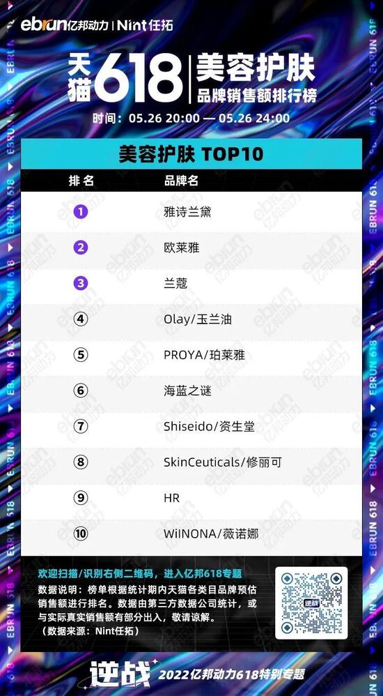 根据前4小时预售数据,美容护肤品依然是“亿元俱乐部”代表,上榜的10个品牌包括雅诗兰黛、欧莱雅、兰蔻、玉兰油、珀莱雅、海蓝之谜、资生堂、修丽可、HR、薇诺娜,预估销售额均超过亿元,不过品牌最高销售额没有超过去年同期,TOP10整体销售额微增。