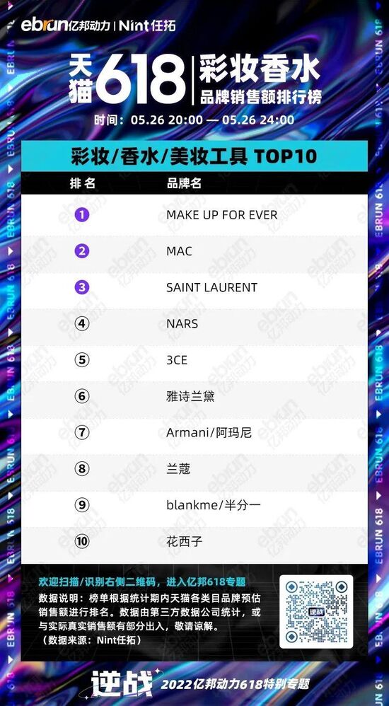 如彩妆香水TOP10“大换血”。其中,make up forever和MAC前4小时预估销售额均在5000万以上,超过圣罗兰跻身TOP1和TOP2,去年前4小时榜上有名的COLOR KEY、纪梵希和美宝莲“消失”,取而代之的是NARS、make up for ever和兰蔻,花西子则仍守住了TOP10位置。