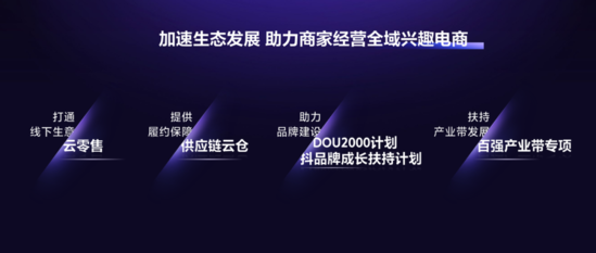 除了通过多场域协同互通,为商家生意带来新增长,我们还在线上线下进行一系列业务布局,加速生态发展,助力商家增长:我们会发力云零售,结合抖音强大的POI能力,联通商家线下,带来全局增长;我们还会建设供应链云仓,协同多地仓配资源,为商家提供解决方案、履约保障,为用户提供更好的物流体验;我们针对头部品牌商家推出DOU2000计划,并继续推进针对新锐品牌的抖品牌计划。全面建设品牌阵地,培养消费者心智,实现品牌增长;针对全国的产业集群,我们打造百强产业带专项,深入地、规模化地扶持产业带商家,发展区域经济。