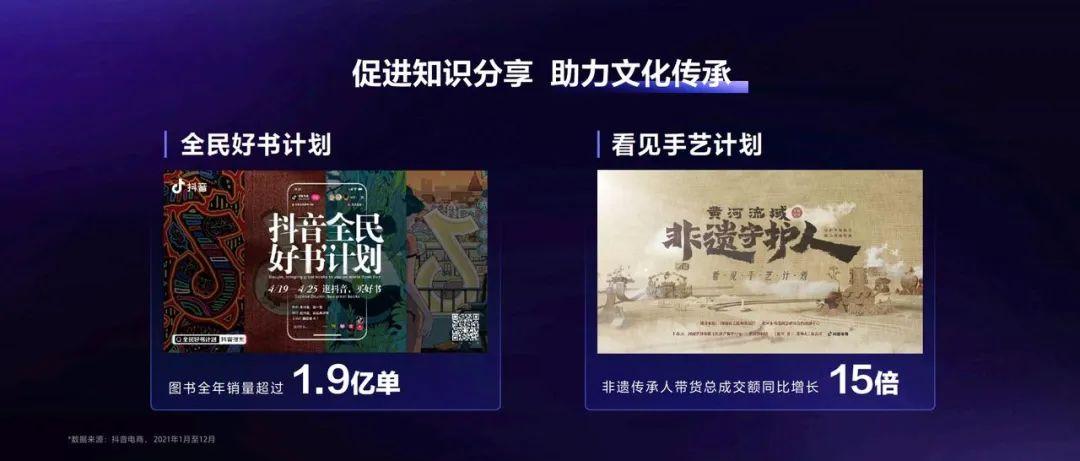 2021年,全民好书计划在抖音广受好评,抖音电商售卖图书超过1.9亿单,读者通过短视频、直播了解图书,通过电商购买图书,这成为了他们日常生活的一部分。2021年,非遗传承人带货增长了15倍,无数非遗创作者用短视频、直播介绍技艺、传承文化,带动销售。我们用这种方式守护非遗文化。