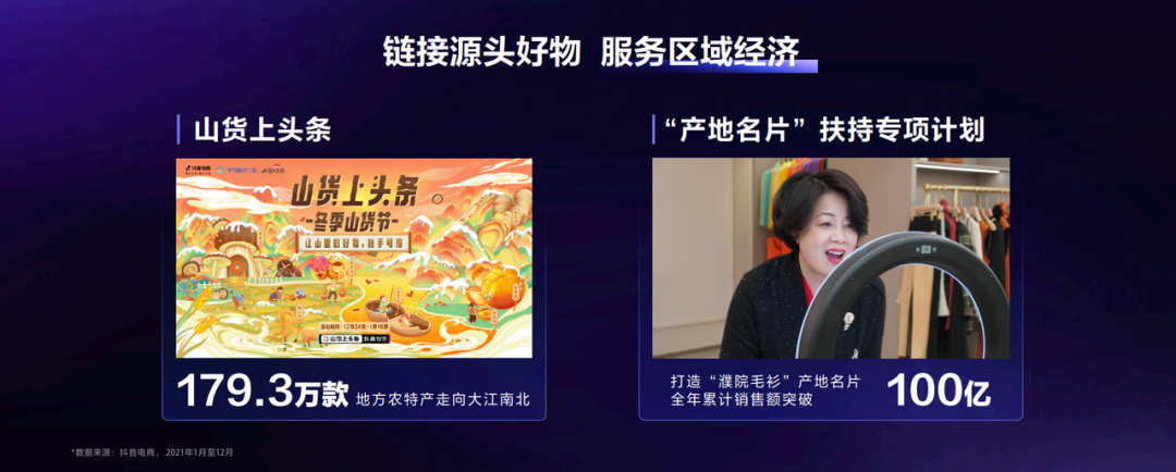 我们联合了各地政府、协会,推出了“产地名片”项目,助力区域经济发展。浙江的“濮院毛衫”产地名片为濮院商家带来超过100亿的销售额。2022年我们会继续投入这个项目,将更多中国源头产地里的“无名好物”变成“知名好物”。