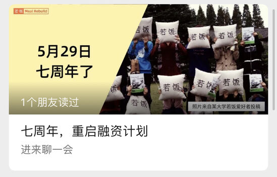 5月29日凌晨,邵炜在若饭公众号发布文章《七周年,重启融资计划》,提到若饭接下来的融资计划,主要为品牌大众化的“破圈”做准备。“饭友已经论证了若饭饮食模式的可行性,供应链已经奠定了大规模服务的基础,而当下大众的健康饮食的确需要有更好的选择。”