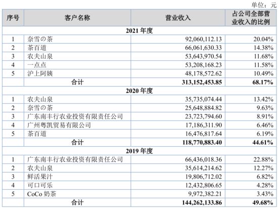 值得注意的是,在新茶饮以外,田野股份还有一个重要客户——饮料巨头农夫山泉。它旗下拥有“水溶C100”“农夫果园”“农夫山泉NFC果汁”等多个果汁品牌。从2019年到2021年,虽然农夫山泉的采购规模持续上升,但增长速度远不及新茶饮品品牌,所以到2021年时,它在田野股份总营收中的占比已经甚至低于2019年。