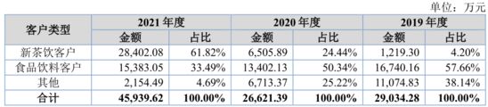 在田野股份的前五大客户名单中,越来越多新茶饮品牌登场,取代传统食品饮料企业。新茶饮客户贡献的收入比例,从2019年的4.2%快速提升至6成以上。