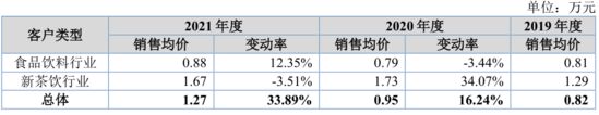 这一点也反映在了田野的招股书中——2021年,田野向新茶饮行业出售的产品均价从2020年的1.73万元下降到1.67万元——在食品饮料行业上游自2021年以来纷纷涨价的背景下,这个状况着实不妙。