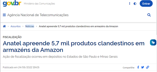 这一次的检查就是巴西国家电信局组织的第二次大型现场抽检。自 2018 年以来,检查行动已经查封了约 460 万件违规产品,估计总价值为 5 亿雷亚尔(9490万美元)。