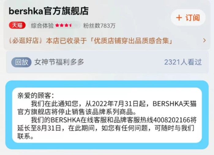 ZARA母公司Inditex旗下Bershka、Pull&Bear和Stradivarius三个品牌电商渠道发布闭店公告,自2022年7月31日起,在线商店将停止销售品牌系列商品,并称品牌在线客服和品牌客服热线将延长至8月31日。