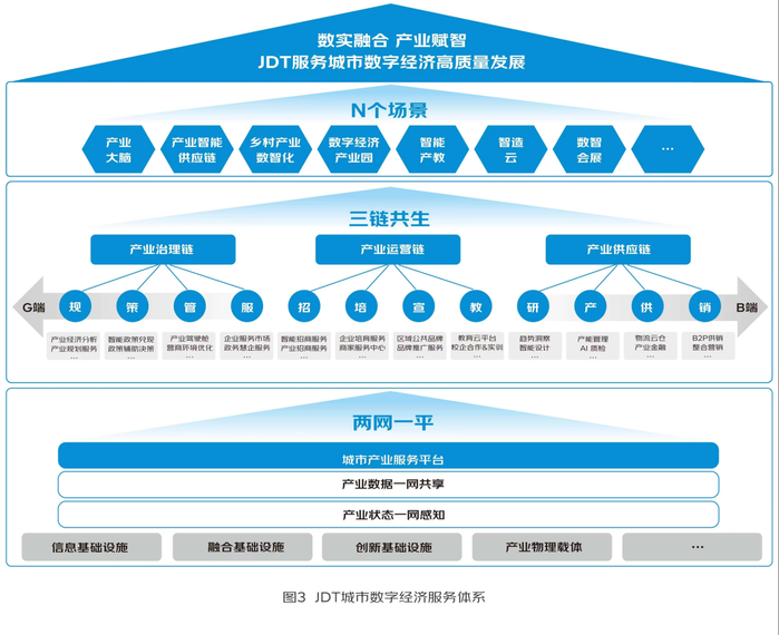 白皮书显示,JDT城市数字经济“两网一平、三链共生”服务体系的“两网”是依托产业级智能物联网服务平台构建产业感知体系,基于产业数据仓搭建产业数据资源体系,实现“产业状态一网感知、产业数据一网共享”;“一平”即京东科技利用新一代数智技术,面向城市产业发展场景打造城市产业服务平台,强化产业数智化技术与服务供给,实现“产业赋智”;“三链”是京东科技构建覆盖产业治理链、产业运营链、产业供应链的“三链共生” 服务体系,以数智技术提升城市产业治理能力、促进产业融合发展、推动产业链供应链变革,全方位助力城市数字经济高质量发展。
