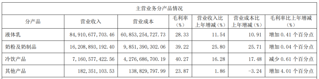 其中,冷饮产品本期实现主营业务收入71.61亿元,较上期增加10.03亿元,同比增长16.28%,本期主营业务成本42.77亿元,较上期增加6.37亿元,同比增长17.48%,其中因销量上升增加收入5.96亿元、增加成本3.10亿元,因产品结构调整增加收入2.83亿元,因销售价格变动增加收入1.24亿元,因材料价格变动、产品结构调整增加成本2.86亿元,装卸运输增加成本0.41亿元。