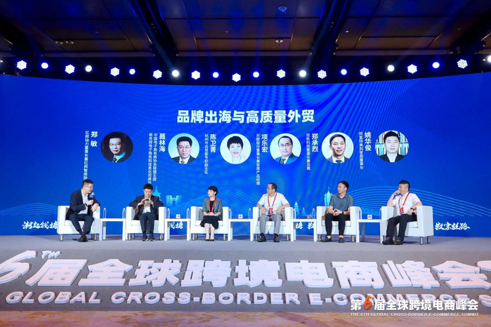 【亿邦原创】7月28日消息,在“潮起钱塘”第六届全球跨境电商峰会上,中国电子商务商协会联盟主席聂林海、杭州市自贸委专职副主任陈卫菁、乐歌股份董事长兼首席产品经理项乐宏、双枪科技董事长兼总裁郑承烈、同富特美刻家居董事长姚华俊与嘉宾主持亿邦动力董事长郑敏就《品牌出海与高质量外贸》这一话题展开了深度对话。