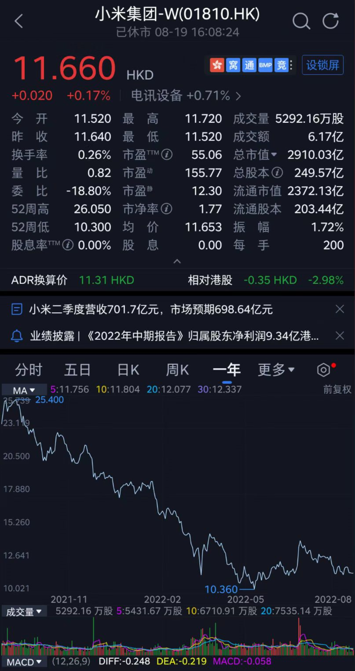 另外,截至今年6月30日,小米中国大陆地区线下零售店数量已超10600家。从股价表现来看,小米集团今年跌幅超过38%。