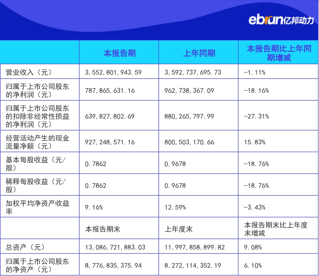 | 归属于上市公司股东的净利润(元) | 787,865,631.16 | 962,738,367.09 | -18.16% |