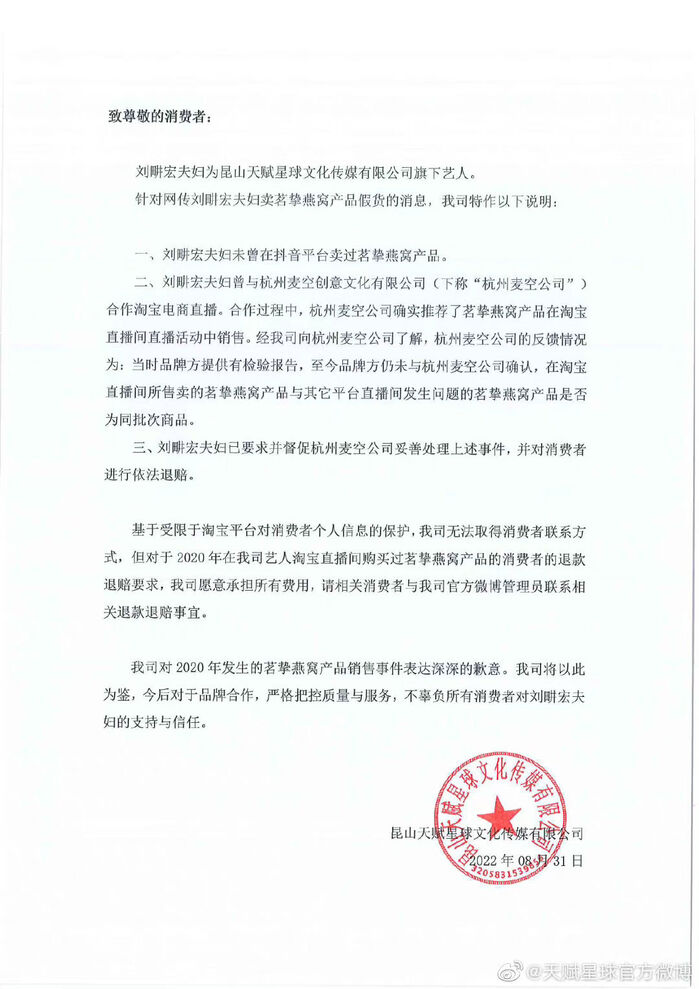 天赋星球声明明确了几个关键信息:1、刘畊宏夫妇未曾在抖音平台卖过茗挚燕窝产品。2、刘畊宏此前与杭州麦空公司合作的淘宝直播活动中推荐过相关产品,曾提供检验报告,并不确认与其他平台发生问题的产品为同批次。3、刘畊宏夫妇已要求杭州麦空妥善处理该事件,并向消费者赔偿。