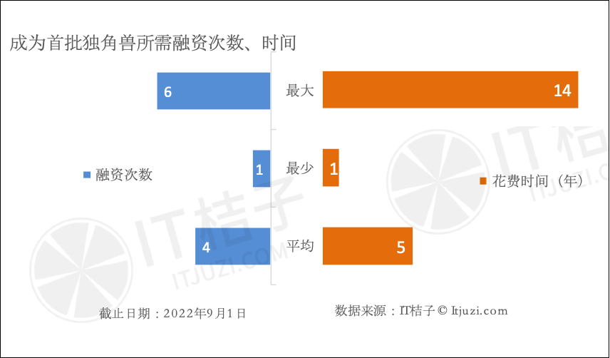 IT桔子数据显示,他们平均需要在成立后近5 年的时间内融资4 次,也就是在2010~2011年左右成立,并保持平均每年融资1 次以上的节奏和速度,才可能甩开同行,跻身独角兽。
