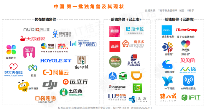 中国第一批独角兽有仍在榜单的如字节跳动、春雨医生、微医、大疆等,也有后来上市退出榜单的如蘑菇街、拉卡拉、陆金所等,还有一部分被挪出榜单的如金银岛、辣妈帮、人人贷等。
