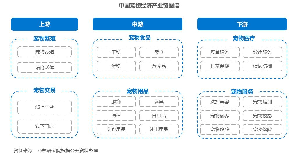 产业链结构:由上游养殖及贩卖、中游宠物产品及下游宠物服务构成