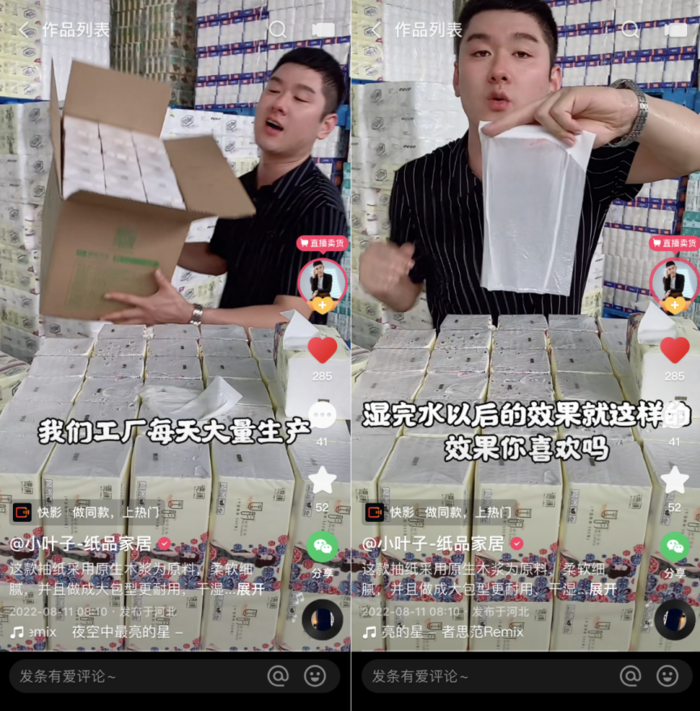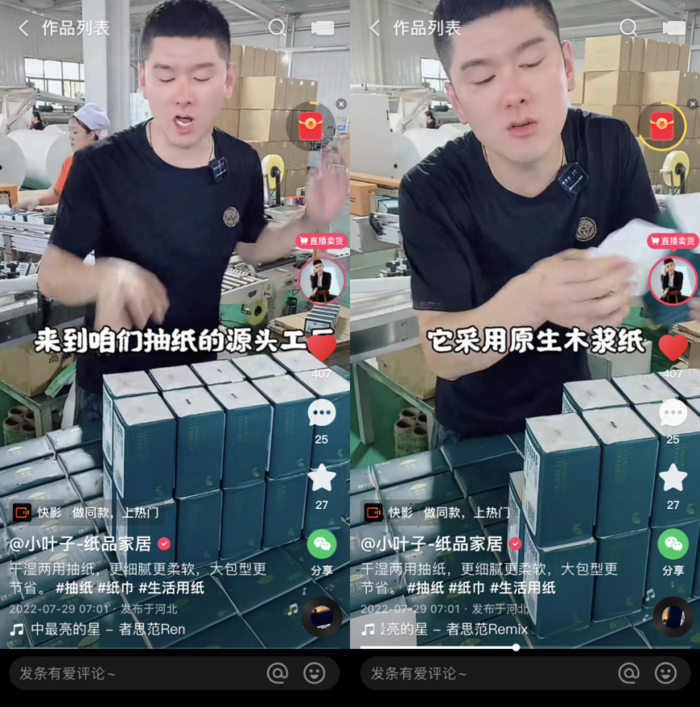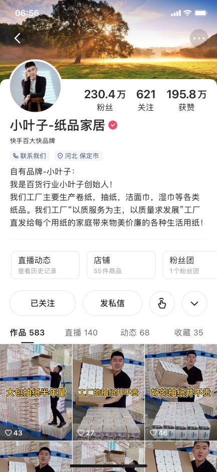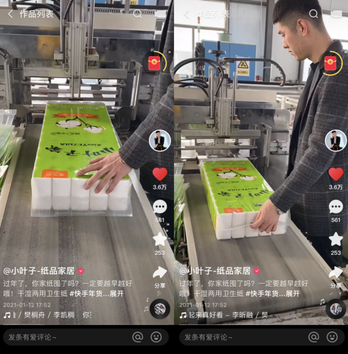 彼时短视频平台刚刚兴起,在小叶子的生活工作圈中掀起热潮。“身边几乎每个人都用快手刷段子,当作日常消遣。”一次在哥哥家造纸工厂帮忙的小叶,也“赶时髦”随手拍了一个生产纸巾的视频发到了快手上。“一开始没当回事,直到晚上打开私信,发现不少用户询问价格和购买渠道,我才意识到,这可能是个机会。”