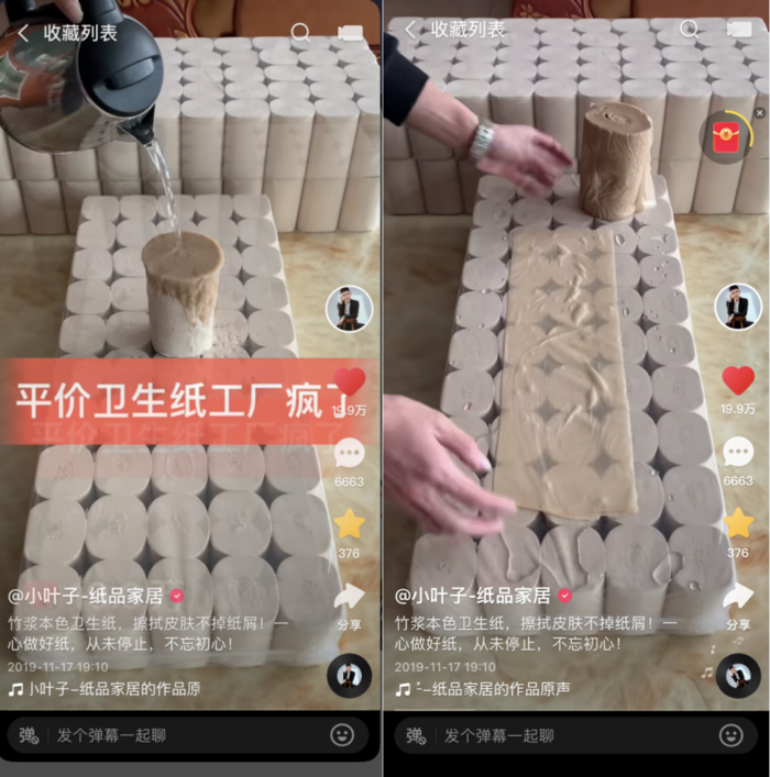 随着流量源源不断地涌来,小叶子备受鼓舞,一连几天保持着视频更新。生产线场景拍腻了之后,小叶子就在工厂中捣腾起了花活:拿起一壶水,朝着纸巾上一浇,再用湿透了的纸巾拎起整包纸,以此向大家证明纸巾的韧性。