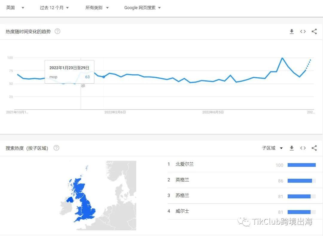 搜mop,我们可以看到近12个月热度随时间变化的趋势,其中今年8~10月份是一波高峰期,搜索热度较高的区域是北爱尔兰、英格兰和苏格兰等。