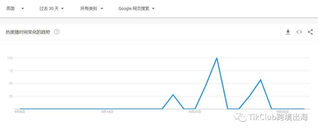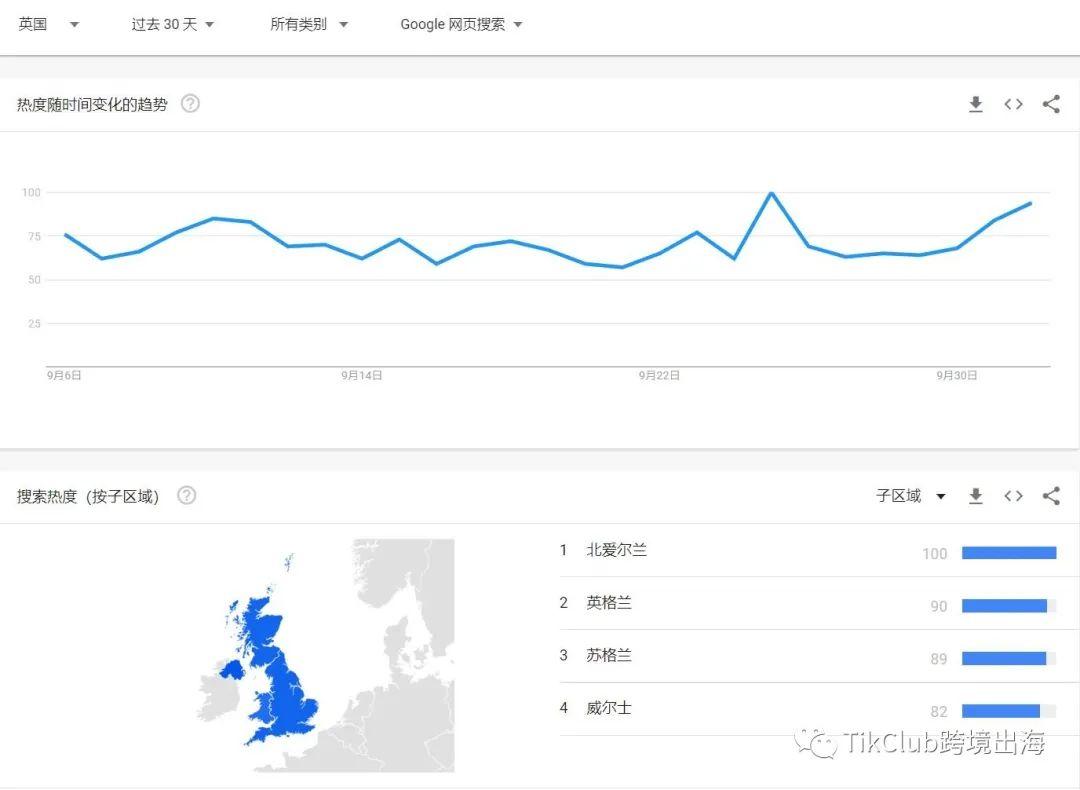 再看近30天热度随时间变化的趋势,其中9月25号迎来小高峰,搜索热度区域依然是北爱尔兰、英格兰等。