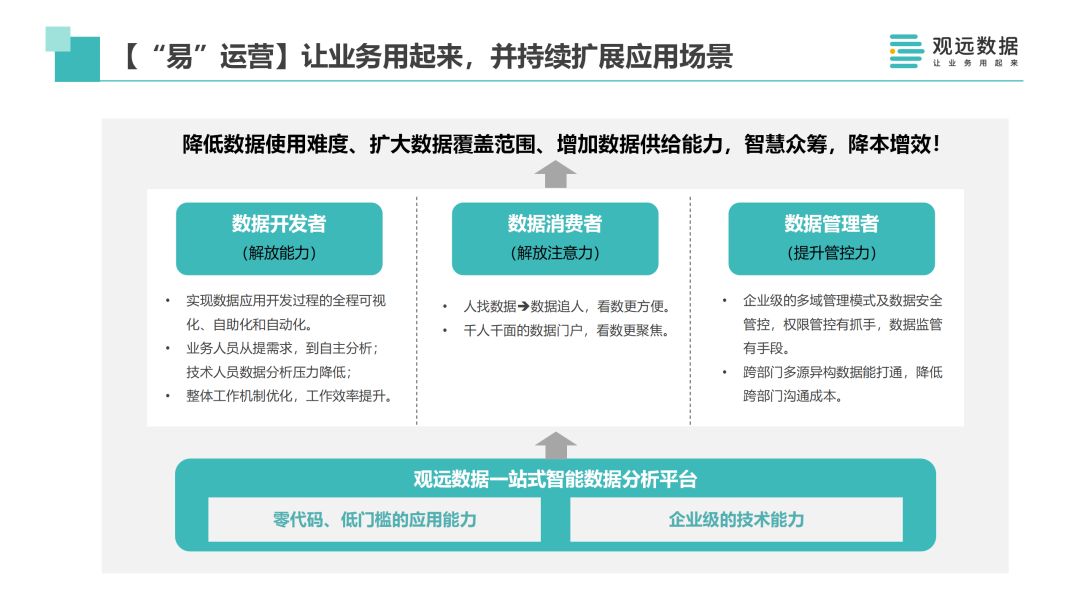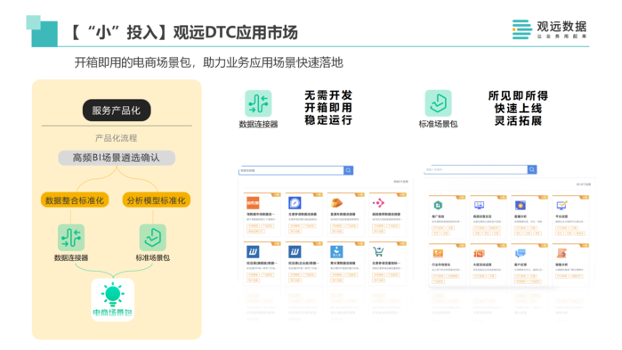 “小”投入更多指的是聪明的投入。我们内部经常说观远数据提供的数据分析与决策平台产品,更像是Meta Product。为什么这么讲?我们真正去用这些国内外的数据分析平台,发现在引进了工具之后还需要投入大量的人力。因为要在Meta Product上面去构建内容,这些内容才是真正能够连接业务,解决业务的诉求和问题的智能产品类型。