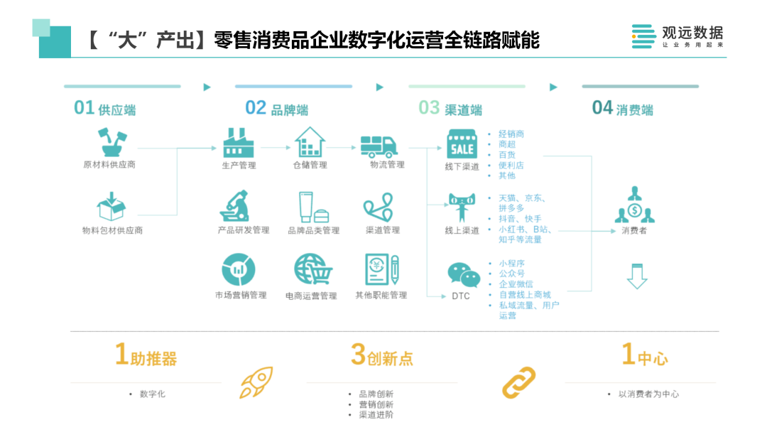 最后是“大”产出。我们常说星星之火,可以燎原。当我们让更多的人、更多的角色能够在整个平台上有机地协同,能够真正用起来的时候,数字化才会变成一个助推器,支撑品牌“以消费者为中心”的品牌创新、营销创新和渠道进阶。在不同的链路上,使用合适的规划和手段,以及运营不同阶段的运营和培养机制,才能达成端到端的全链路数字化运营的赋能。
