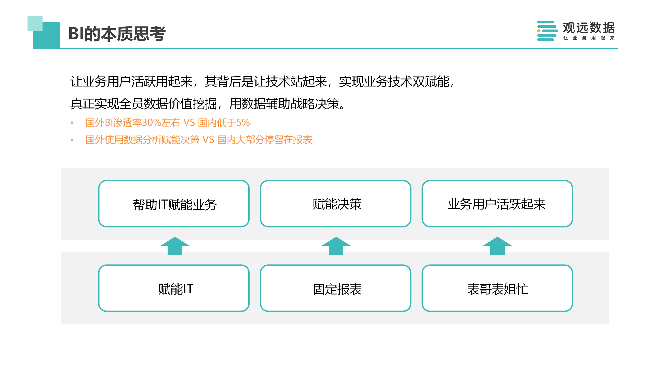 做这件事情,关键在于要从赋能IT,转变成帮助IT赋能业务;从固定报表,到能够真正的赋能决策;让繁忙的表哥表姐,变成让业务用户真正用起来。