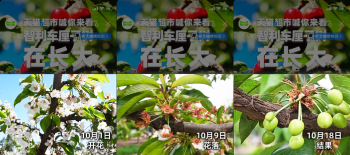 9月28日,天猫超市开启首批智利车厘子预售,同步开启的还有慢直播,记录一棵智利车厘子树从开花、花落、到结果的全过程,下单的网友可以通过天猫超市视频号看到自己的车厘子长成什么样了,“已经下单,亲自催生”。