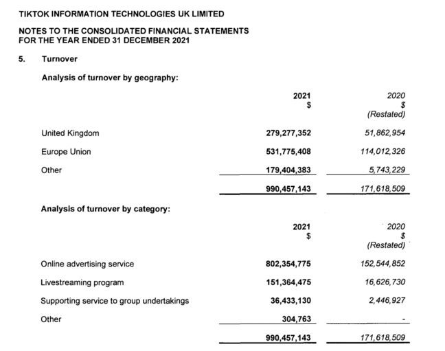 近日,TikTok公开了2021年欧洲地区的营收,文件显示,2021年,TikTok在欧洲的营收超过9.9亿美元,相比去年的1.72亿美元,增加了近六倍。其中大部分收入来自欧盟,为5.32亿美元,英国则为2.79亿美元。