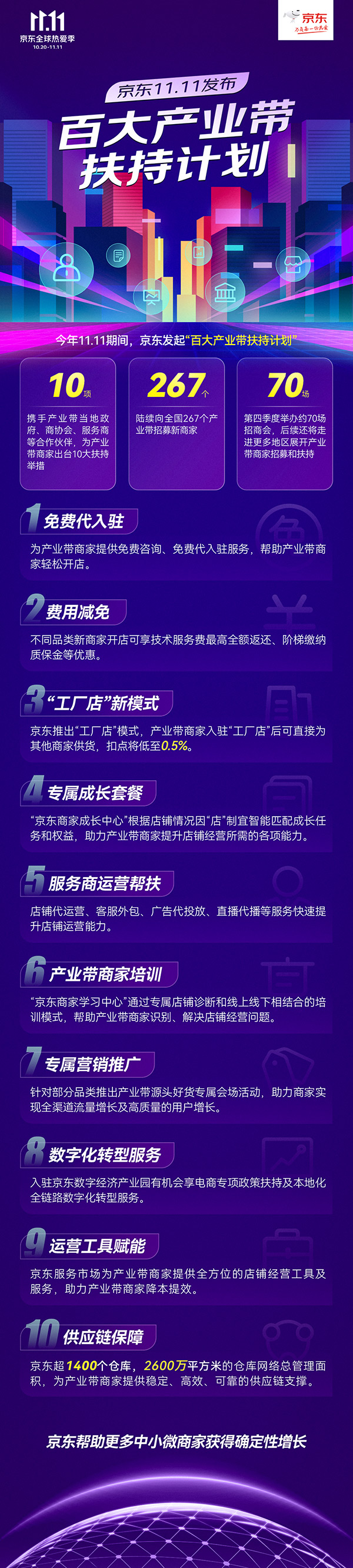为了扶持更多产业带中小企业、品牌商、工厂,京东通过“百大产业带扶持计划”推出了免费代入驻、费用减免、“工厂店”新模式、专属成长套餐、服务商运营帮扶、产业带商家培训、专属营销推广、数字化转型服务、运营工具赋能、供应链保障10项举措。