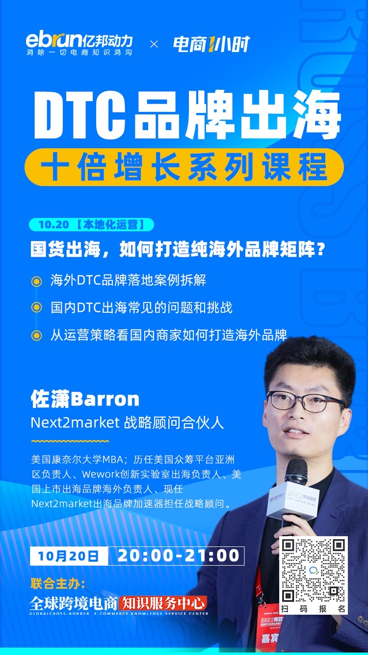 亿邦动力与全球跨境电商知识服务中心携手推出跨境实战系列课程,课程将根据跨境行业发展现状、热点以及政策变化,为企业提供一系列知识服务及实践指导。本期课程,我们邀请到Next2market战略顾问合伙人,佐潇,为我们介绍国货出海如何打造纯海外品牌矩阵。