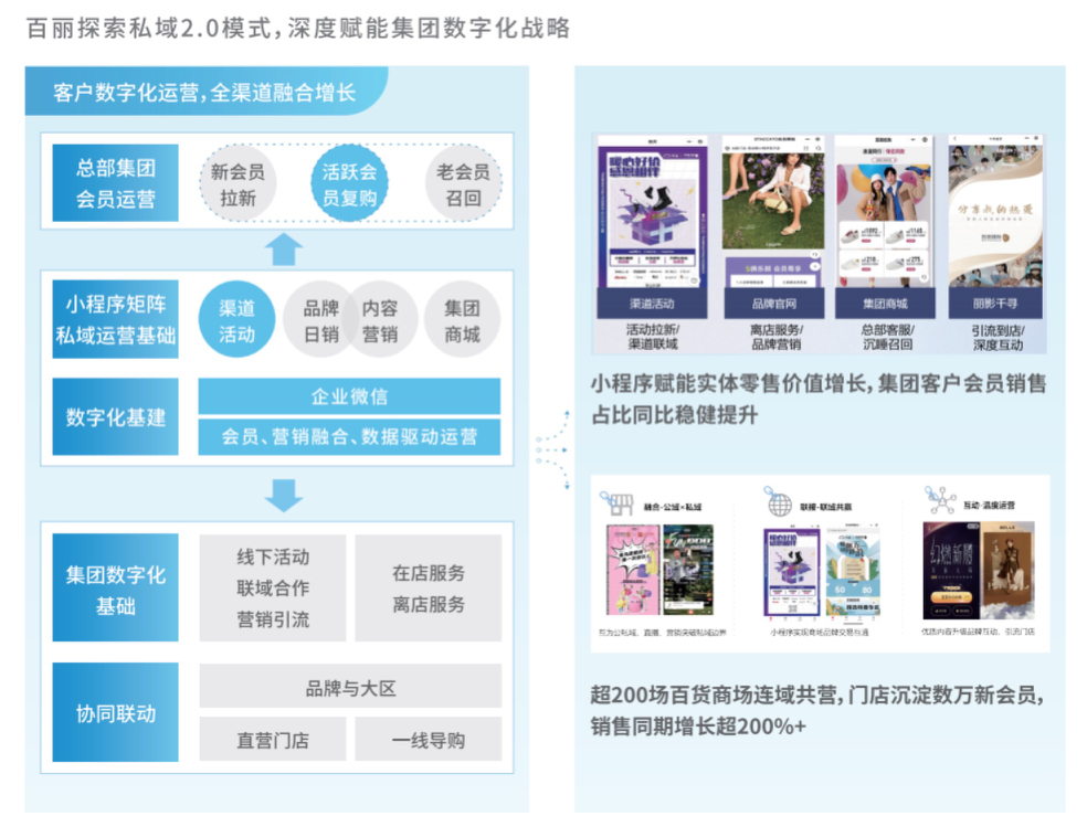 如把集团小程序与腾讯生态内的触点全面打通,通过小程序为门店数字化经营与客户运营助力。在活动销售季,还与商场渠道私域联合运营,通过联域小程序丰富了营销场景,打通腾讯生态云选联盟与荟聚福利栏目,连接全域流量,为终端渠道灌入消费新增量。