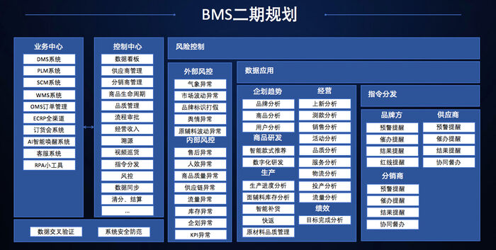 与传统人工、ERP软件等方式组织调动产业链资源不同,鸭鸭用一套数字化的BMS系统实现全链条资源整合管理,充分发挥了数据智能的价值。BMS系统具体包括DMS(数据化流行趋势预测与爆款挖掘)、PLM(数字化研发和研发结果的成果沉淀)、MES(面向工厂执行层的信息化管理系统)、SCM(供应链协同管理)、ECRP(全渠道会员管理系统)等模块。