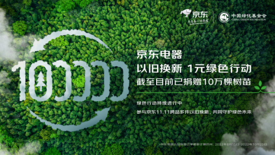 为汇聚更多环保力量,2022年8月京东宣布联合中国绿化基金会开展“以旧换新1元绿色行动”公益项目,用户在用户在京东每完成1笔电器产品以旧换新订单,京东都将捐赠1块钱用于公益种树。据统计,截止10月25日京东已完成10万棵树苗公益捐赠,京东双11期间将持续开展跨品以旧换新行动,让更多老旧电器得到合理回收,践行绿色消费。