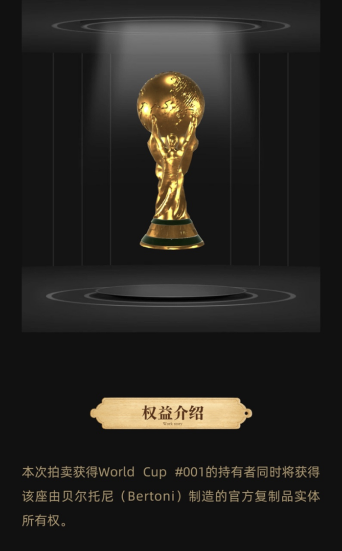 座大力神杯将在11月9日12:00正式开拍,用户通过竞价方式参与,每次加价幅度为1万元,最终这座奖杯将现场交付给成功购得者。该用户还将获得送拍方星铱镧科技提供的“大力神杯”区块链数字藏品版权。