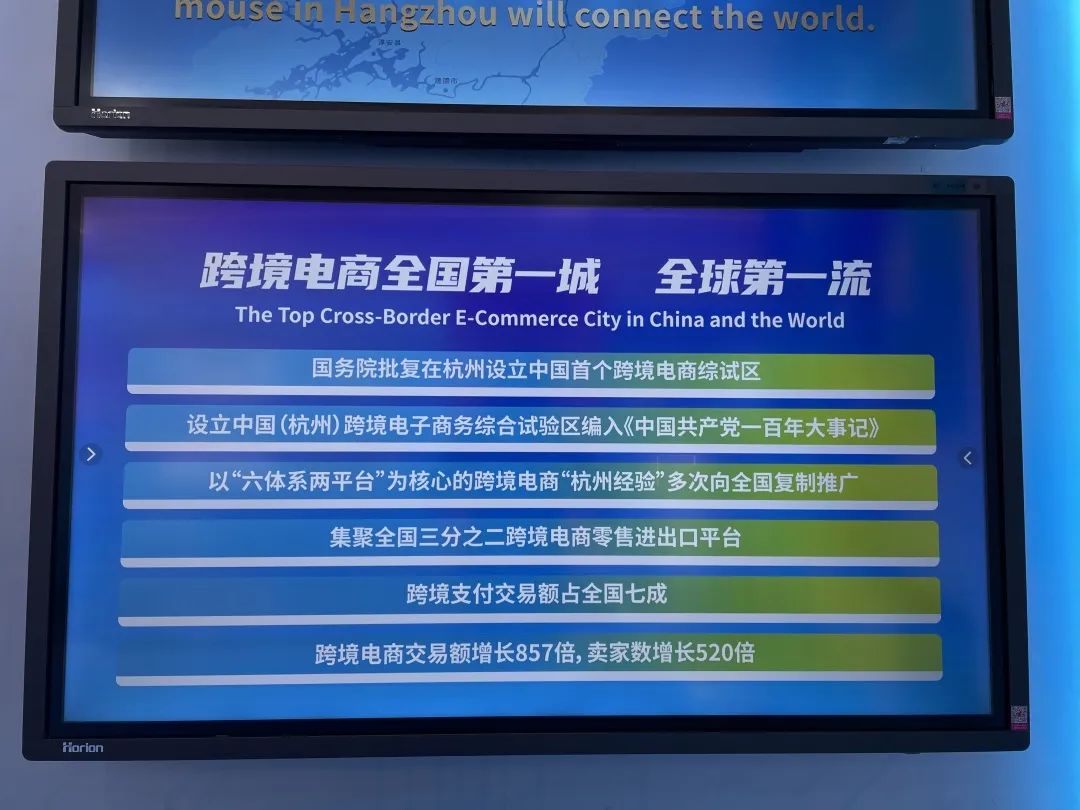 展厅以“在杭州点击鼠标,联通的是整个世界”为主题,全方位展示杭州作为创新活力之城,卖家总部集聚、平台企业活跃、服务生态最优的形象。展厅通过提炼杭州在打造“跨境电商全国第一城,全球第一流”目标过程中取得的经验成果,凸显全国跨境电商综合试验区发展风貌,彰显“致力于推动经济全球化,建设开放型世界经济”的决心和形象。