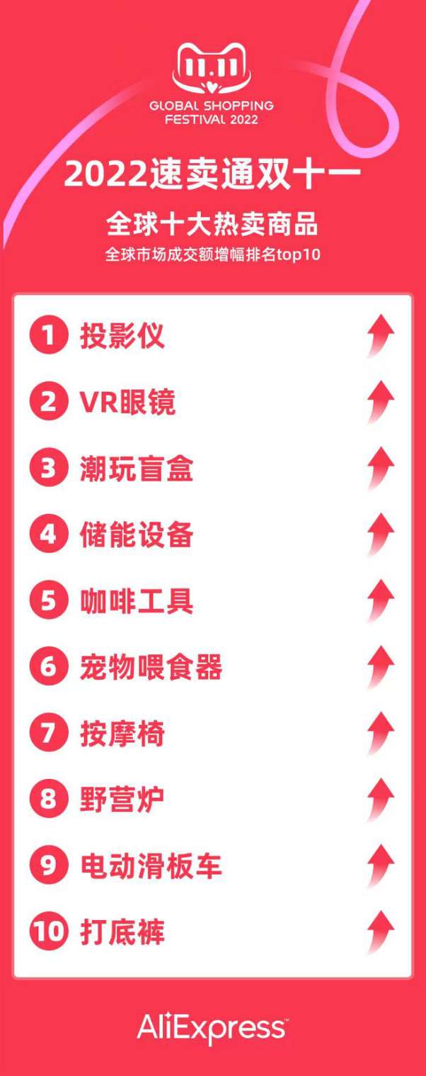 11月13日,速卖通公布了今年海外双十一的全球十大热卖商品,以投影仪、VR眼镜为代表的新一代中国制造正在吸引越来越多的海外消费者。