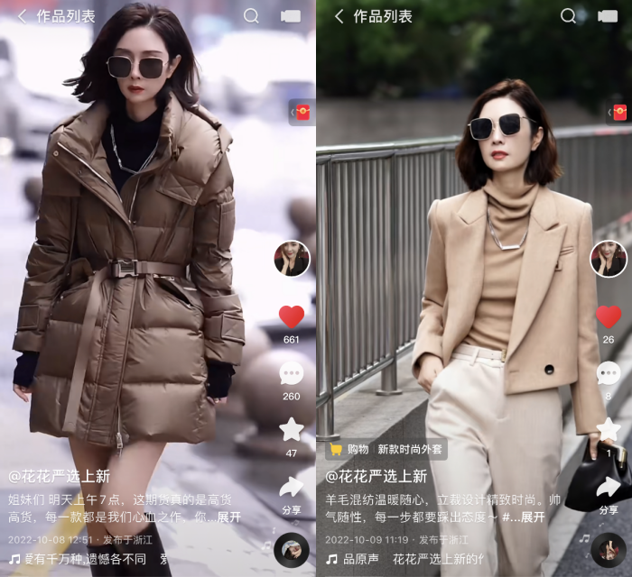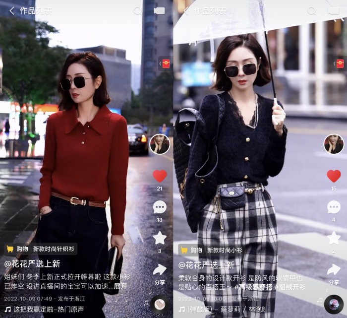 而在短视频方面,花花也以场景街拍内容为主,着重展现独释时尚与质感并存的品牌特性。在直播方面,花花会在每次直播前,根据每件产品的风格、配色、款式进行搭配,从而在直播过程中尽可能展现服装优势。