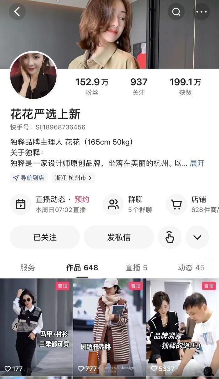 凭借强大服装供应链,独释以设计大气、款式简约等优势,俘获了一众讲究品质、有高消费能力的女性消费者。如今,“独释”成为快手百大快品牌之一,积累了152.9万粉丝,最高单场GMV近500万。