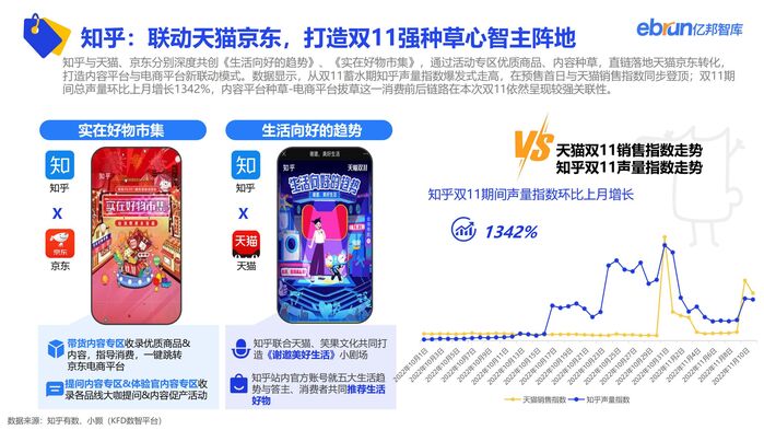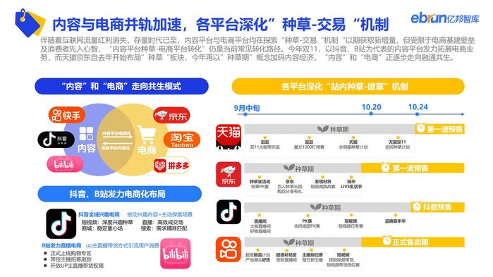 本届双11,天猫京东皆提升优惠力度,注重提升用户端体验及商家扶持力度。抖音重点发力抖音商城,快手打通天猫京东外链,皆通过新布局新模式获得高增长。腾讯荟聚打造双十一“会买节”,带动品牌全域新增量。内容平台方面,知乎联动天猫、京东打造内容平台与电商平台新联动模式,B站通过在直播专区上线“购物”专区首度参战;小红书站内站外双布局,发力电商板块。本次双11,内容与电商之间的藩篱在逐步打破。